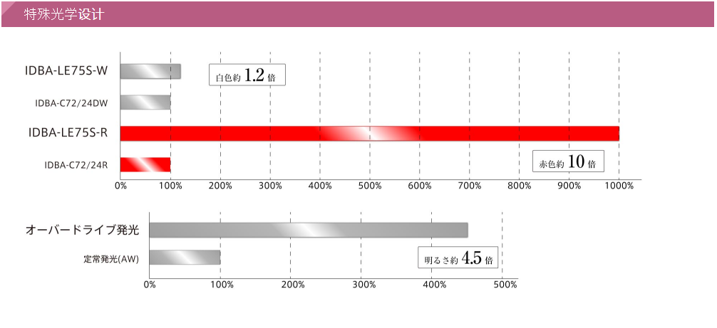 紅色是傳統光的10倍。即使在1500mm以上的遠距離照射下也能確保高照度。