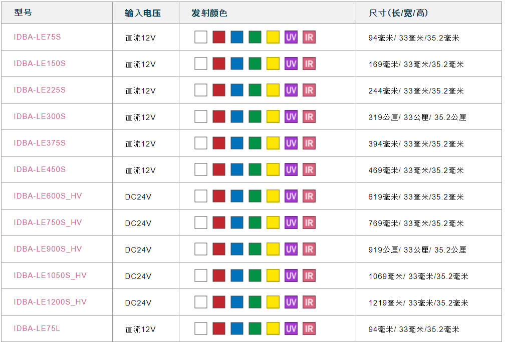 發出的顏色是白色,紅色,藍色,綠色,黃色,紅外線和紫外線,照射類型為可以照射高范圍的“ S型”和可以遠距離照射的“ L型”。