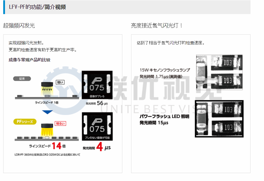實現“超強頻閃” 同軸系列PF系列的強光閃光燈,最大瞬時照度為370萬lx,有助于更快地進行檢查和更高的精度。-替代氙氣閃光燈。- 專用電源微調發光定時 ,可以精確地調節相機快門的發光應用示例:檢查光澤表面和鏡面表面的缺陷,劃痕,標記,凹痕等